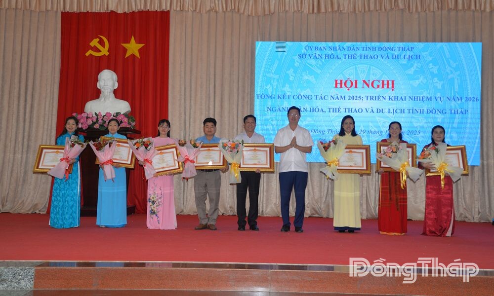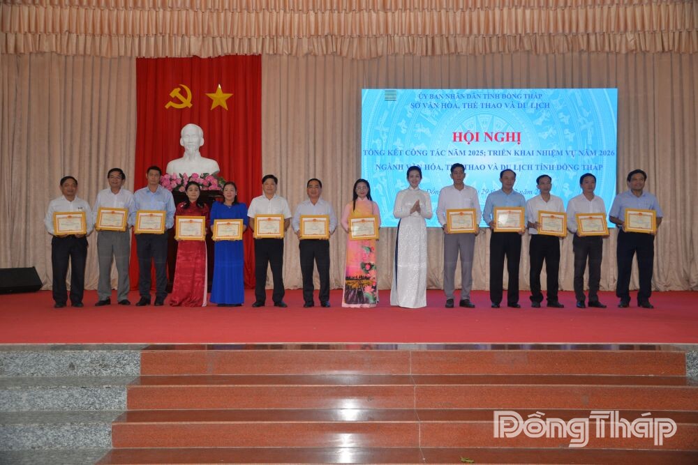 Dịp này, 9 cá nhân nhận Bằng khen của Thủ tướng Chính phủ có thành tích trong công tác từ năm 2020 đến năm 2024; Sở VHTT&DL tặng Giấy khen cho 13 tập thể đã có đóng góp trong hoạt động của ngành VHTT&DL tỉnh Đồng Tháp năm 2025.
