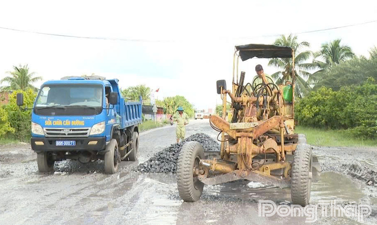 (ĐTO) Thời gian qua, trên địa bàn tỉnh Đồng Tháp, mưa lớn thường xuyên và kéo dài kết hợp với triều cường dâng cao gây ảnh hưởng nghiêm trọng đến kết cấu hạ tầng giao thông đường bộ. Nhiều tuyến đường bị ngập sâu, thoát nước chậm; bên cạnh đó, còn khá nhiều tuyến đường đã quá thời hạn khai thác sử dụng cũng như chưa được đầu tư xây dựng hệ thống thoát nước dọc làm cho nền, mặt đường ứ đọng nước dẫn đến nhanh xuống cấp, phát sinh nhiều đoạn tuyến bị biến dạng, hư hỏng ổ gà, ổ voi…