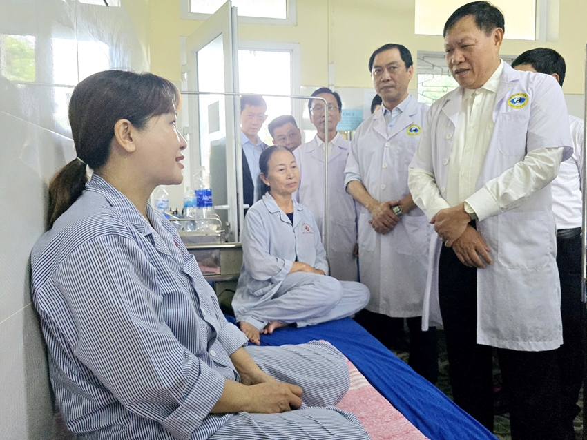Thứ trưởng Bộ Y tế Đỗ Xuân Tuyên (bìa phải) thăm hỏi, động viên các bệnh nhân đang điều trị tại Bệnh viện Y học cổ truyền TP. Huế