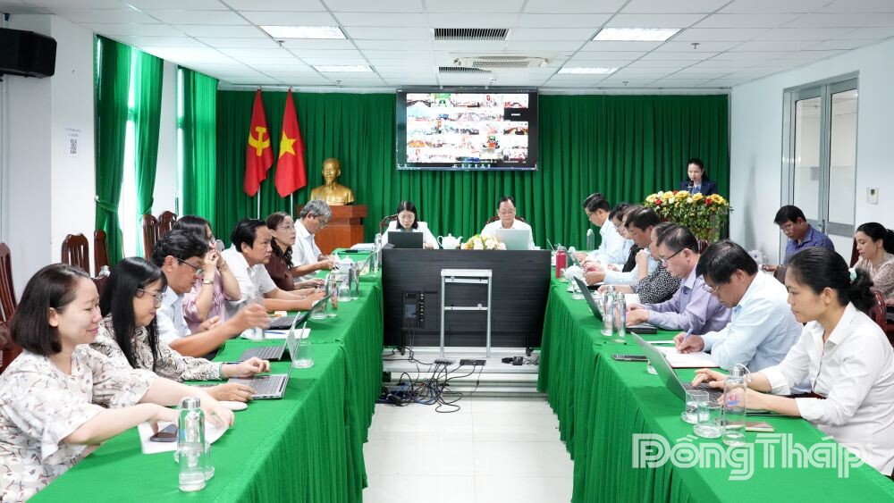 Quang cảnh tại điểm cầu chính Sở Y tế, các đại biểu nghe TS,BS Giảng Thị Mộng Huyền, Trưởng Phòng Kế hoạch tài chính báo cáo kết quả hoạt động y tế 3 tháng đầu năm và triển khai nhiệm vụ 9 tháng năm 2026.