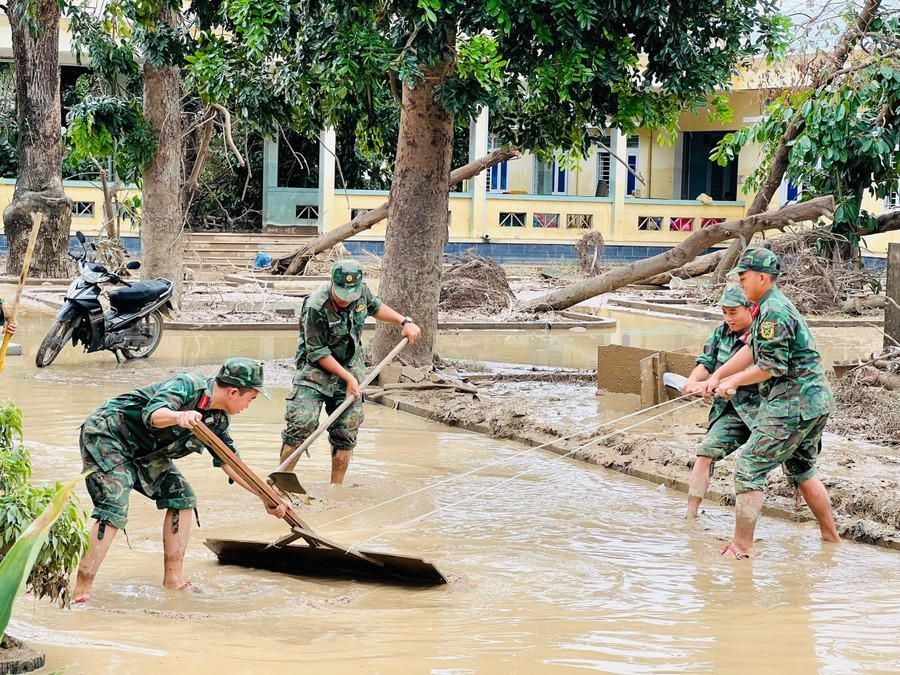 Ngay khi nước rút, hàng chục cán bộ, chiến sĩ Trung đoàn 739 được điều động khẩn cấp để hỗ trợ vệ sinh, khôi phục hạ tầng, phun khử khuẩn và từng bước nối lại hoạt động của bệnh viện.