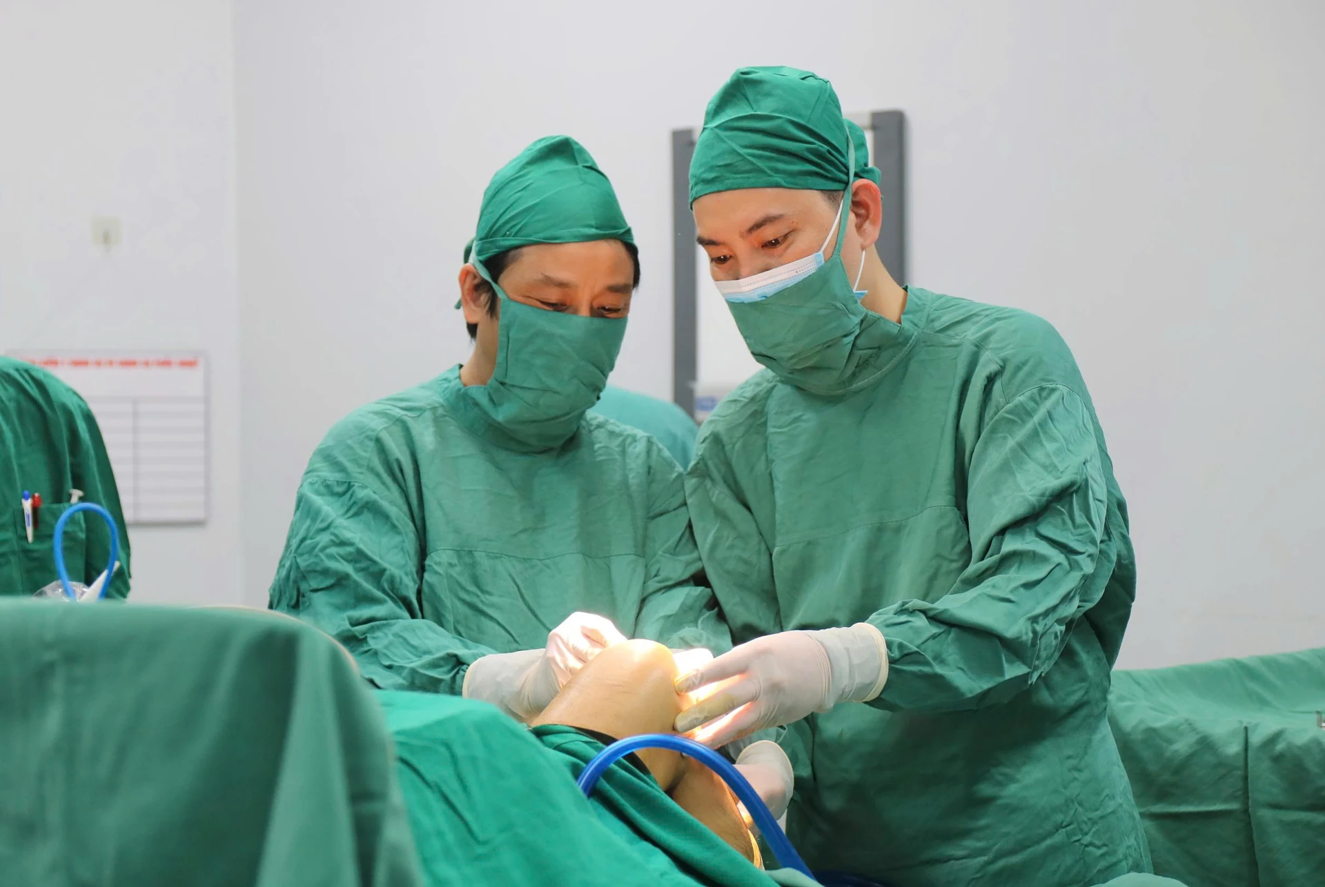 Bác sĩ BVĐKKV Bắc Quảng Trị được chuyên gia Bệnh viện Đại học Y-Dược Huế “cầm tay chỉ việc”, chuyển giao kỹ thuật nội soi khớp gối - Ảnh: H.L