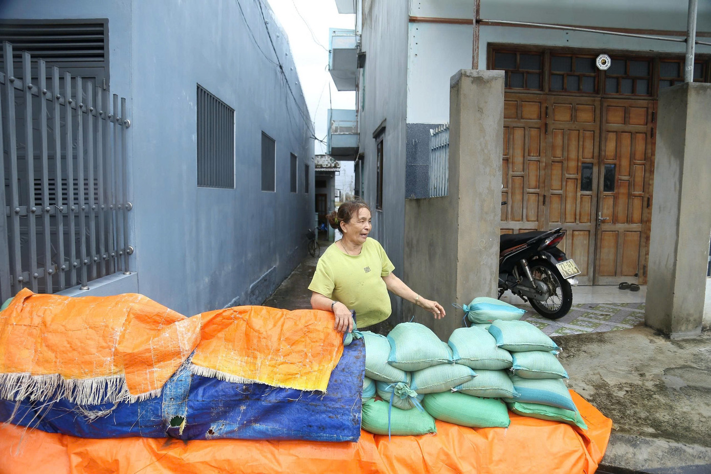 Người dân thôn Huỳnh Giản (xã Tuy Phước Đông) lấy bao cát gói trong bạt dựng thành tường để ngăn lũ vào nhà.