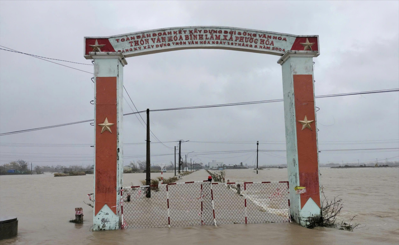 Khu vực qua xã Phước Hòa (cũ) cũng mênh mông biển nước, tuyến đường đã được chính quyền địa phương rào chắn ngăn giao thông qua lại để đảm bảo an toàn.