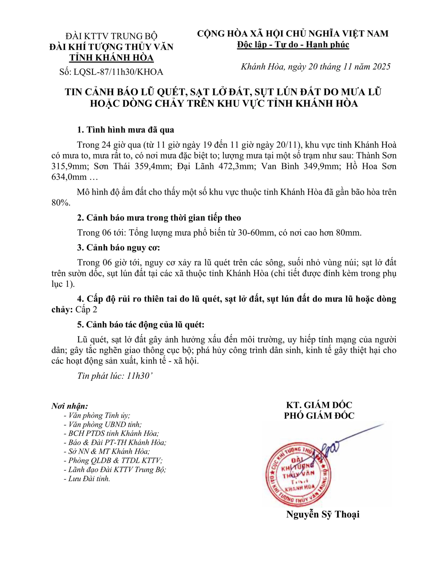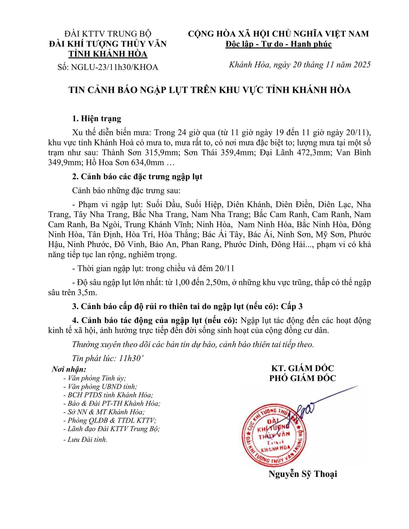 report Cảnh báo ngập lụt, sạt lở trên khu vực tỉnh Khánh Hòa (tin phát lúc 11h30 ngày 20/11)