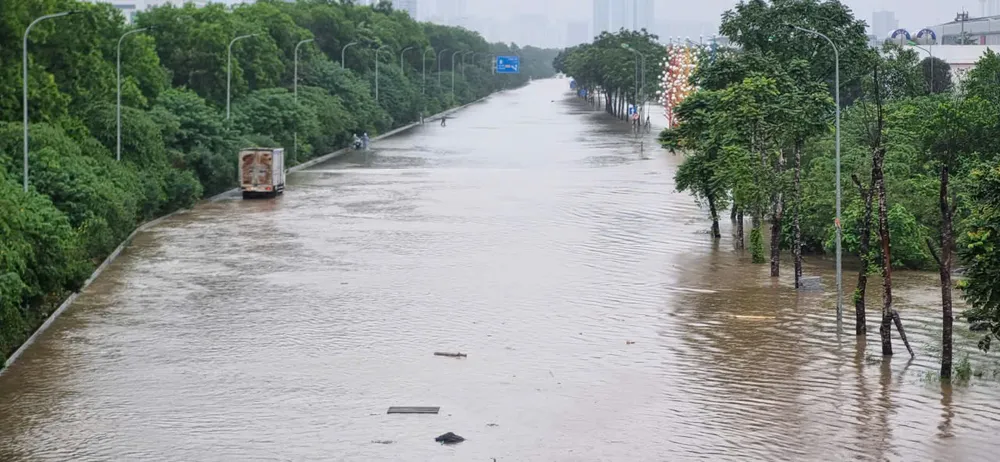 Khu vực Đại lộ Thăng Long (Hà Nội) đường biến thành sông, các phương tiện cố đi qua đều chết máy. Ảnh: V.LONG