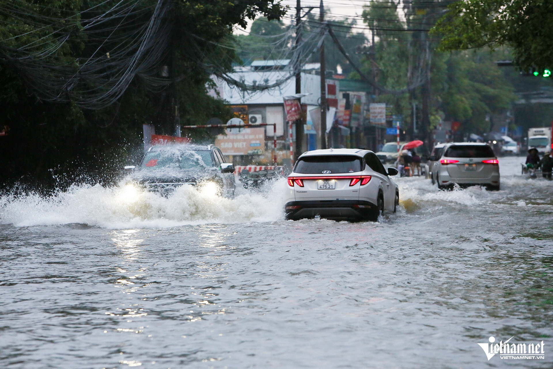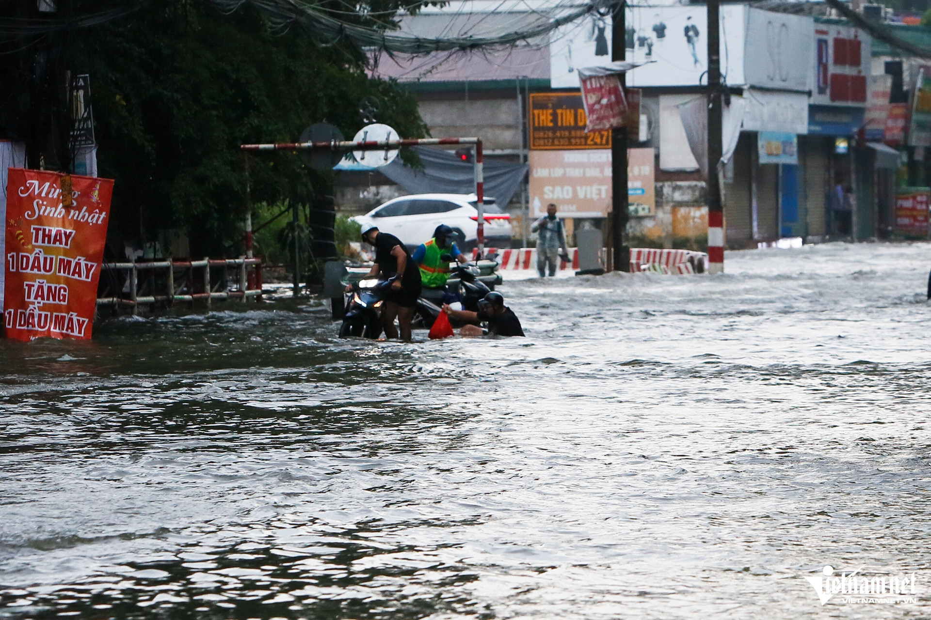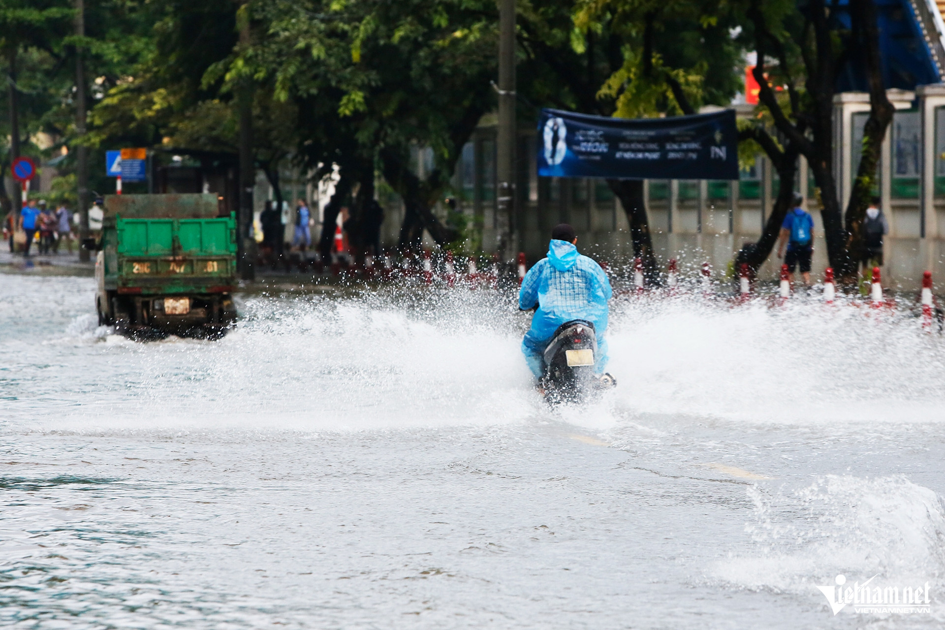 Tại một số khu dân cư lân cận, nước vẫn ngập sâu tới khoảng nửa mét. Dù vậy, nhiều người dân vẫn buộc phải lội qua các điểm ngập để kịp giờ đi làm.