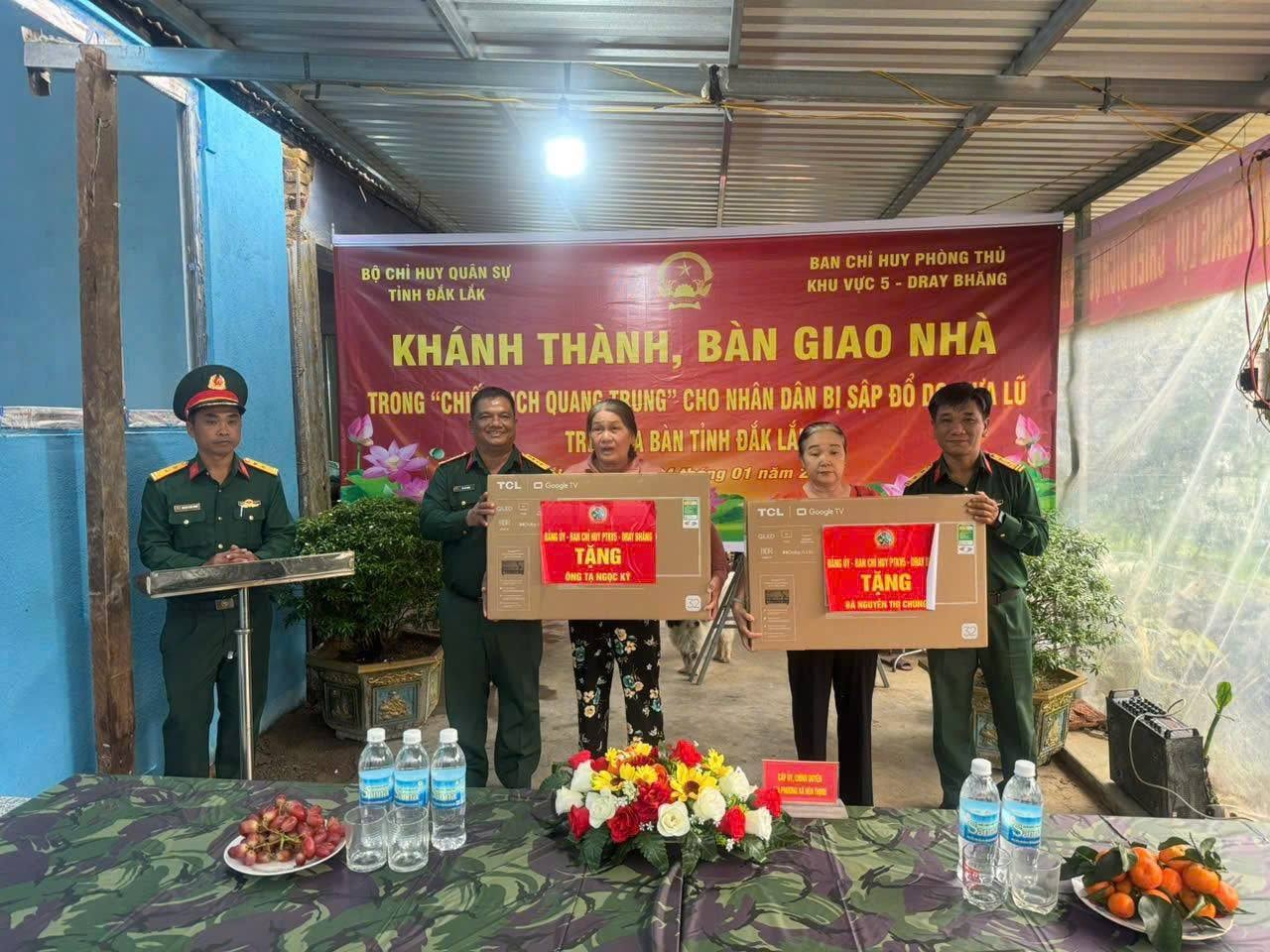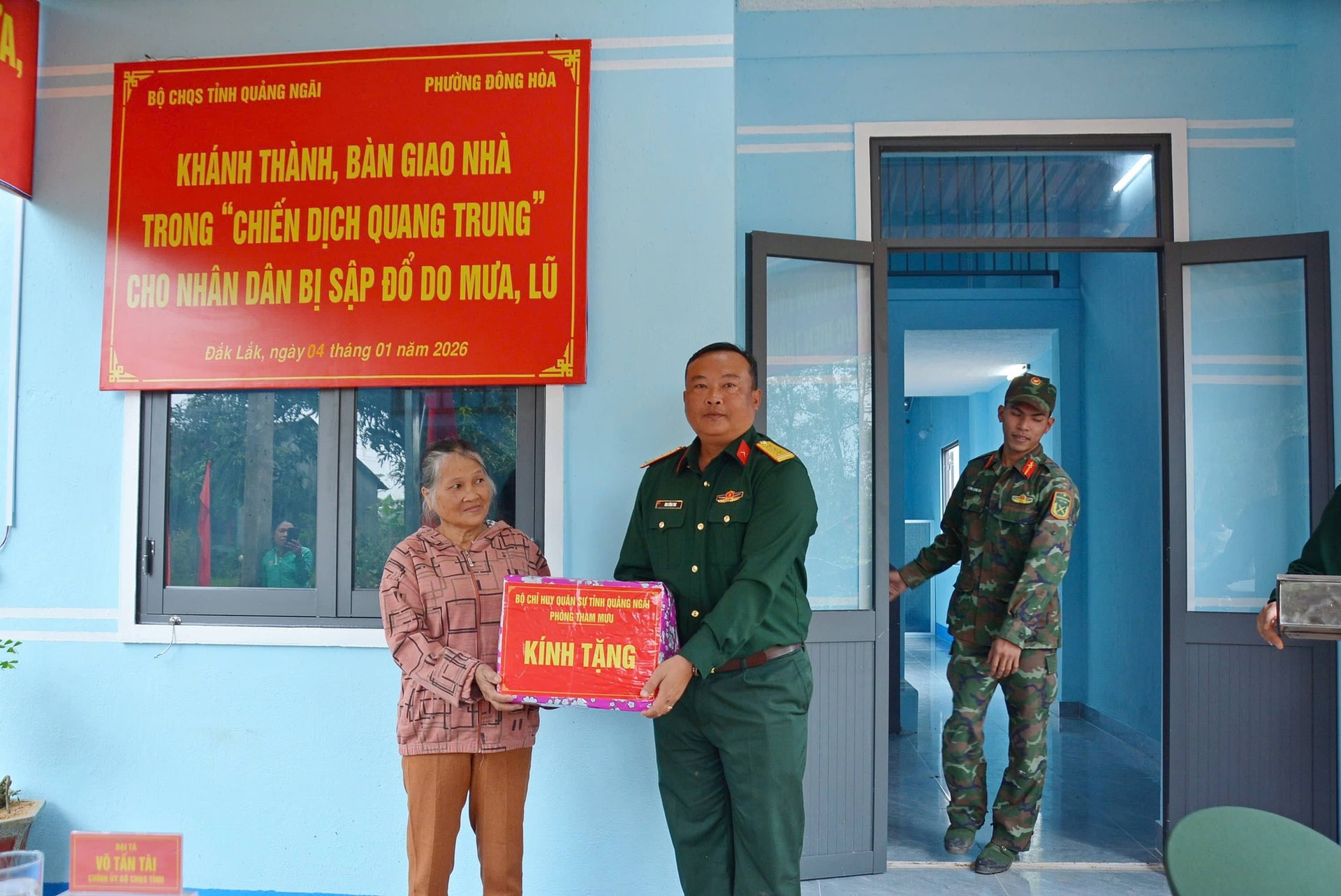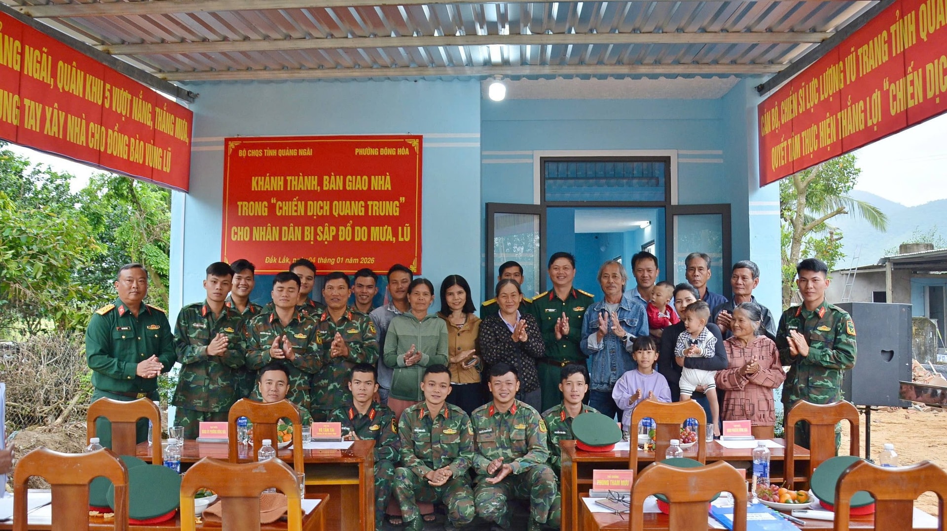 Trước đó, sáng 4-1, Bộ Chỉ huy quân sự tỉnh Quảng Ngãi tổ chức khánh thành và bàn giao nhà cho gia đình bà Nguyễn Thị Ngọc Thảo tại thôn Nam Bình 2, phường Đông Hòa, tỉnh Đắk Lắk. Đây là căn nhà đầu tiên trong tổng số 4 căn nhà do Bộ Chỉ huy quân sự tỉnh được giao nhiệm vụ xây dựng, hỗ trợ người dân vùng lũ khắc phục hậu quả thiên tai.