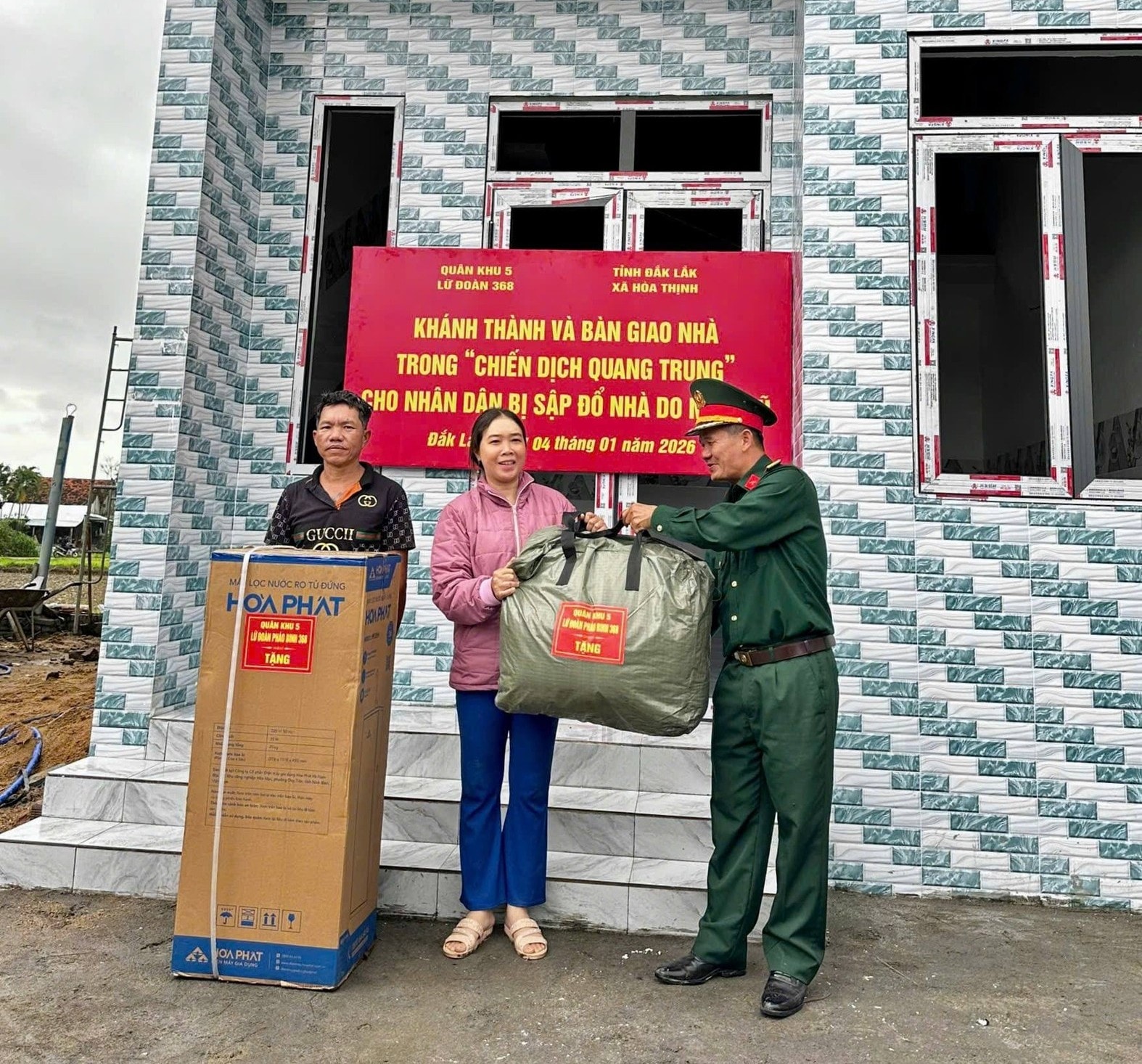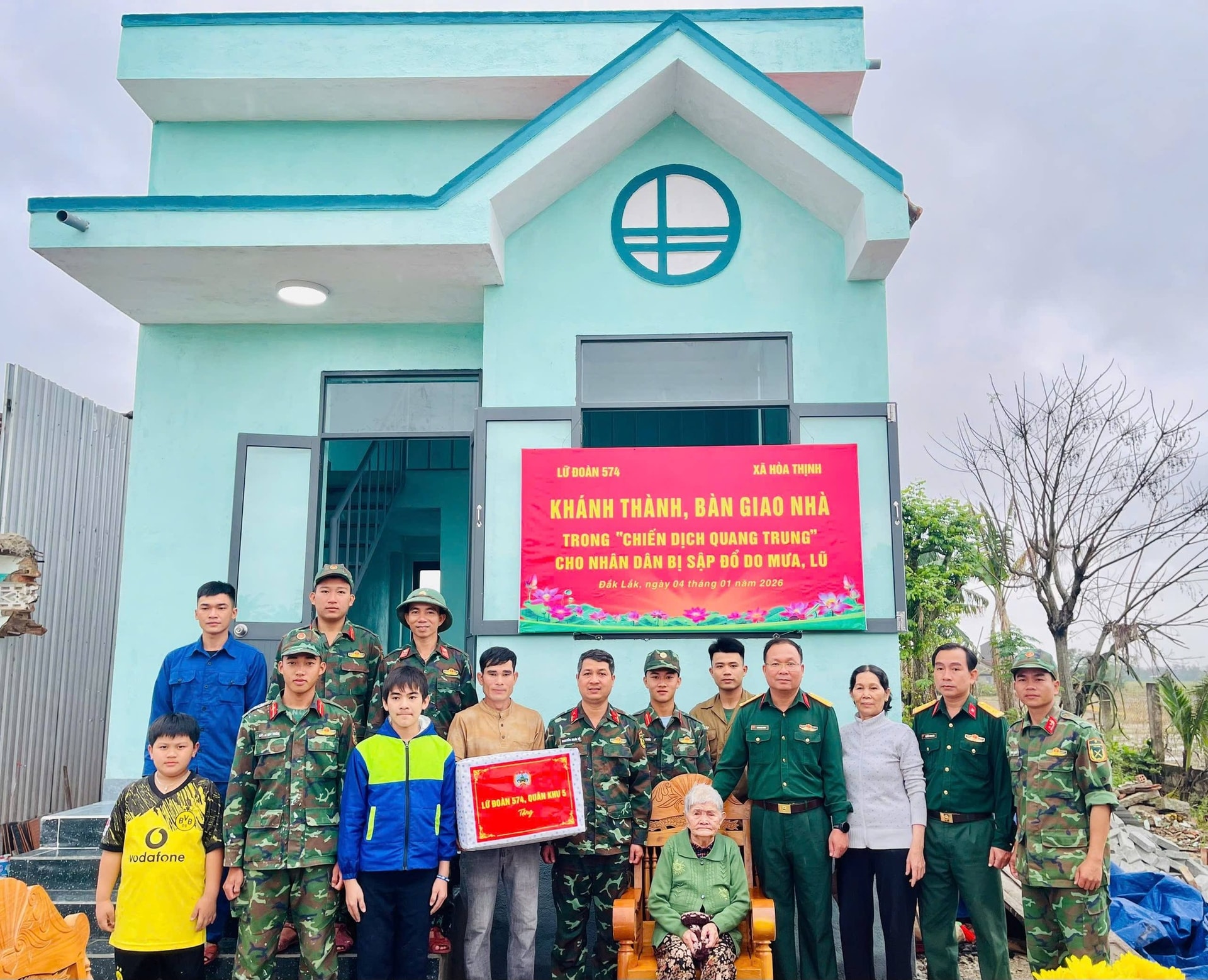 Lữ đoàn 574, Quân khu 5 tổ chức bàn giao 2 căn nhà cho các hộ dân thôn Phú Phong, xã Hòa Thịnh, tỉnh Đắk Lắk. Ảnh: TH574.