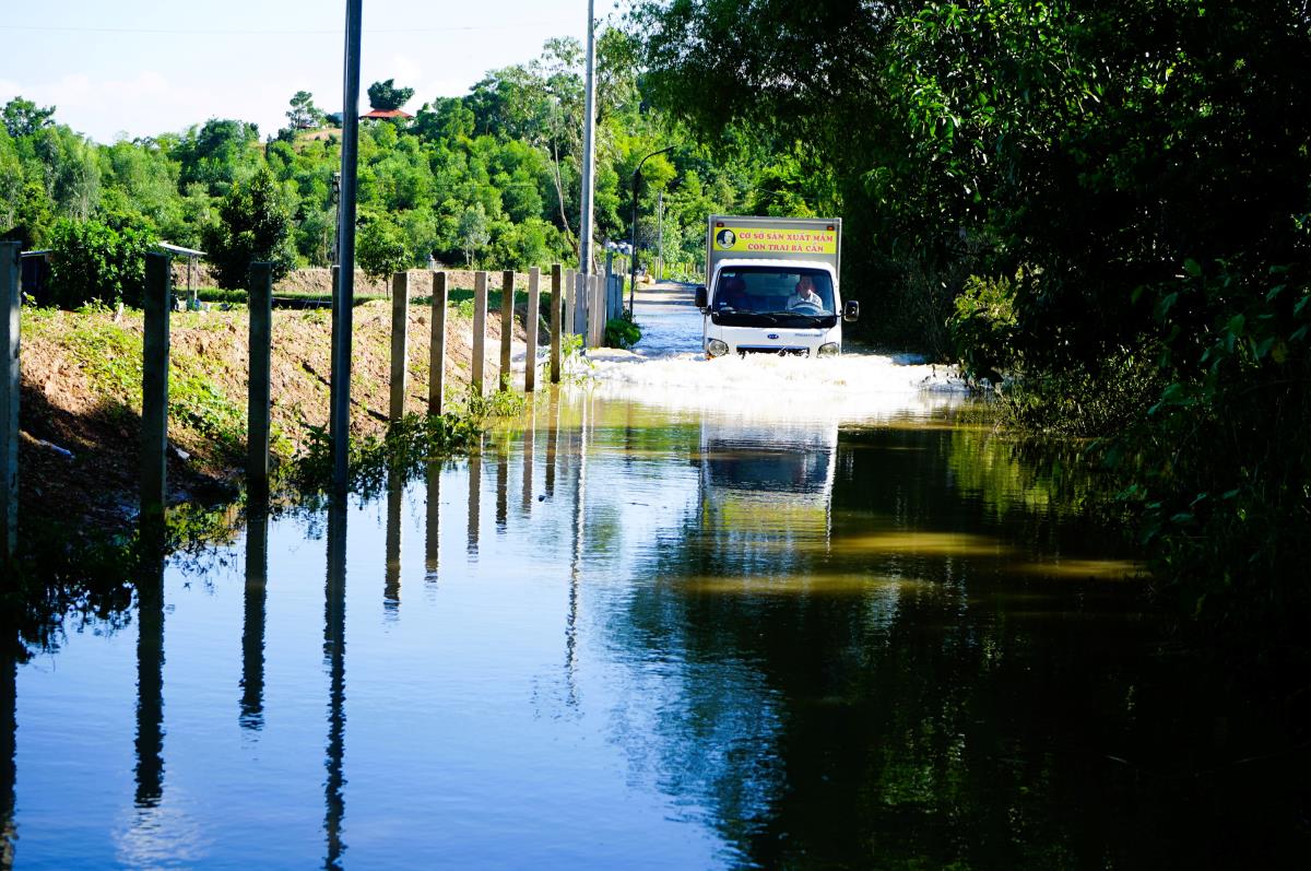 - Theo người dân địa phương cho biết, khu đất nằm dưới chân núi Bồ Bồ (thuộc thôn Đông Đức) trước đây được người dân dùng để trồng lúa nhưng kém hiệu quả. Những năm gần đây, hộ ông Phan Tấn C. (trú thôn Đông Đức) chuyển sang đào ao nuôi cá nước ngọt thương phẩm. Do việc nuôi cá mang lại lợi ích kinh tế cao nên tháng 9-2025, ông C. thuê xe múc về đào thêm, mở rộng diện tích ao nuôi. Tuy nhiên, trong quá trình đào ao, “tiện thể” ông C. lấp luôn mương thoát nước nằm cạnh đường bê-tông. Trong mấy ngày qua có mưa lớn, không còn mương thoát đã gây tình trạng ngập úng tại một số đoạn đường thấp trũng, tràn vào vườn cây của 2 hộ dân kéo dài cho đến hiện tại. Nhiều người dân có ý kiến góp ý, đề nghị khắc phục song ông C. tỏ thái độ bất hợp tác.