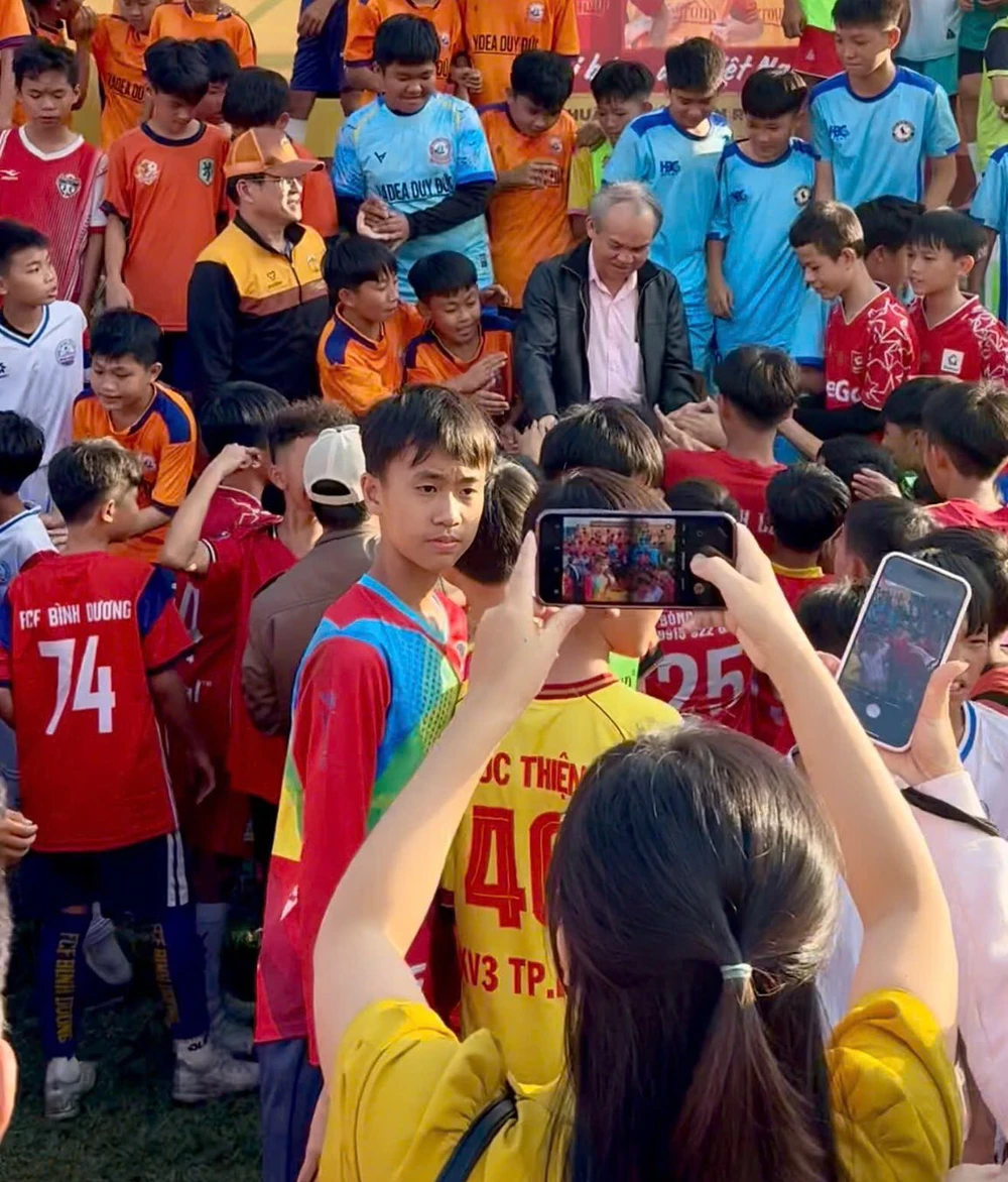 Bầu Đức thưởng nóng cho đội tuyển U-23 Việt Nam ngay trong ngày hội bóng đá nhí ở Hàm Rồng. Ảnh: QA.