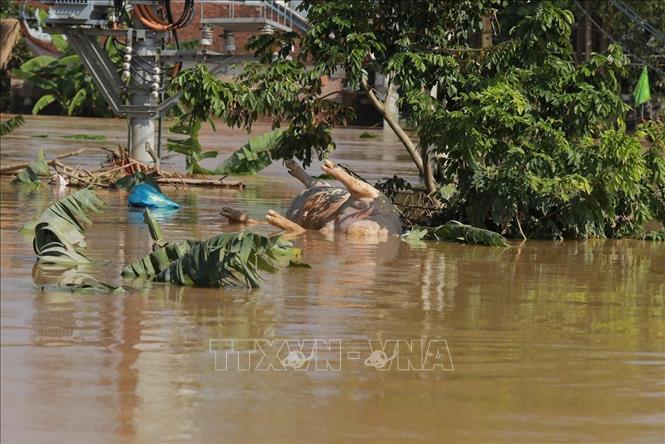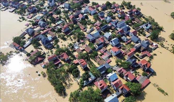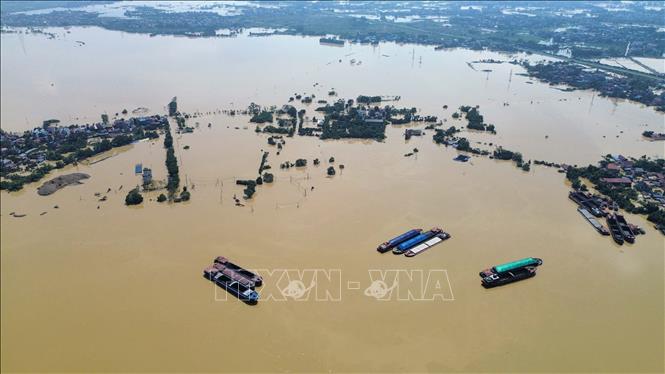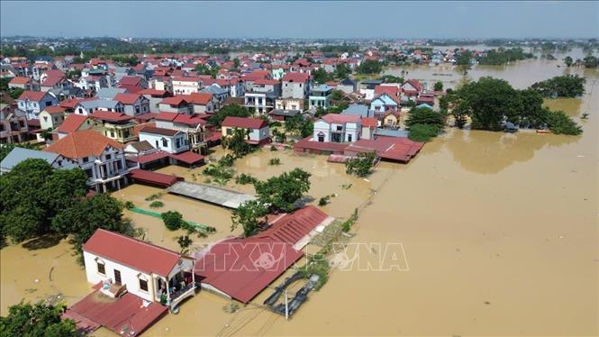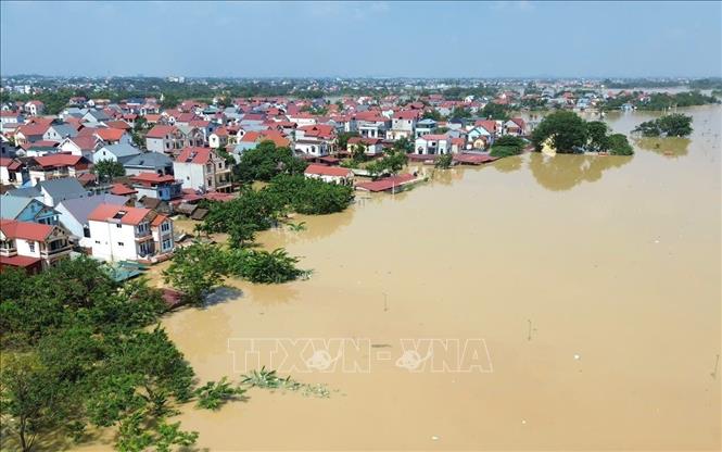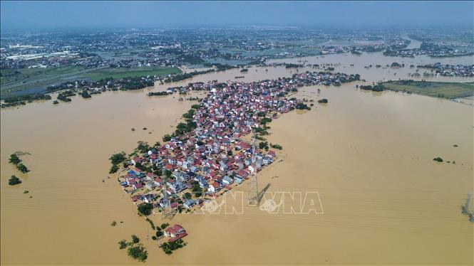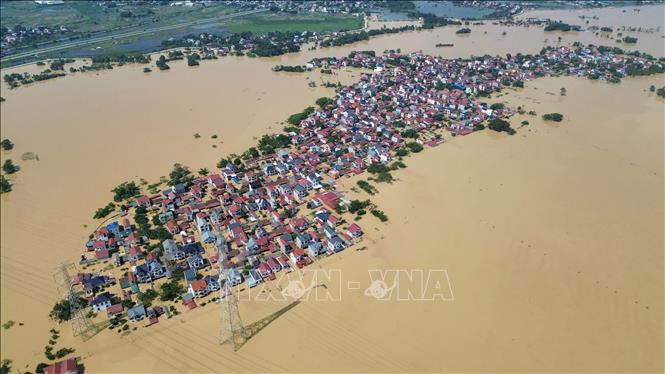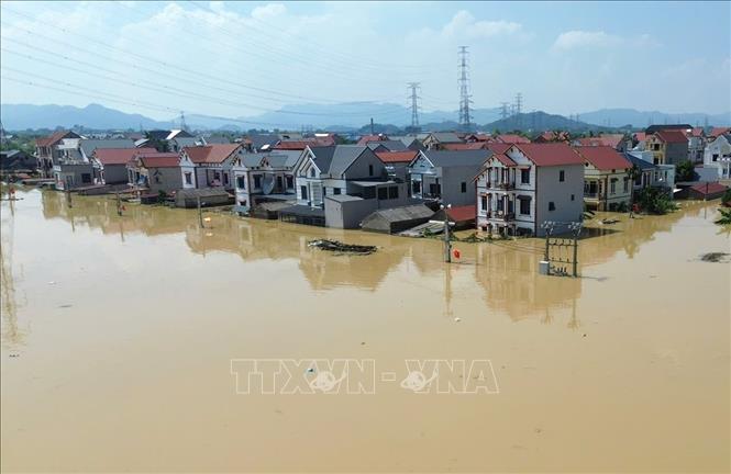 Tỉnh Bắc Ninh đang trải qua đợt ngập lụt nghiêm trọng, nhiều khu dân cư bị nước bao vây, giao thông chia cắt. Biển nước mênh mông phủ kín đồng ruộng và nhà cửa, cuộc sống người dân bị đảo lộn. Ảnh: Thành Phương/TTXVN