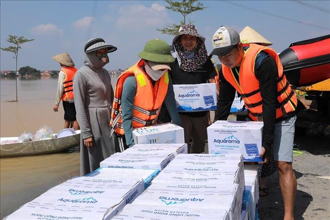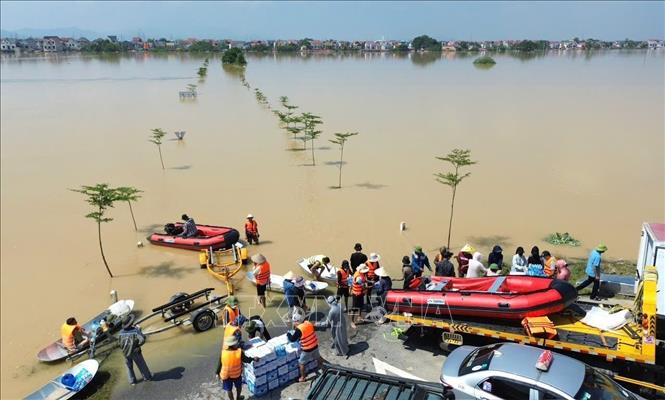 Các lực lượng cứu hộ tích cực triển khai chuyển nước, lương thực hỗ trợ người dân tại xã Hợp Thịnh, Bắc Ninh. Ảnh: Thành Phương/TTXVN