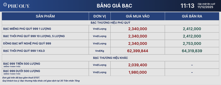 Giá bạc Phú Quý lúc 11 giờ 13 phút sáng 11/12.