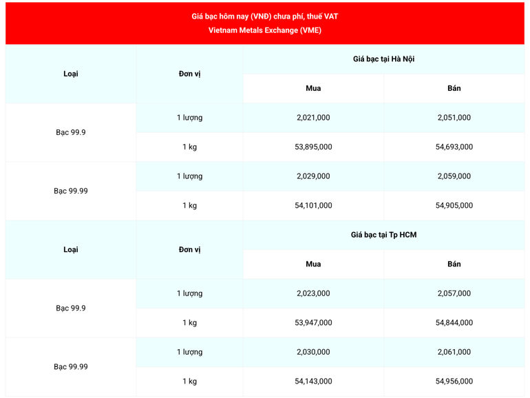 Cụ thể, tại thời điểm 11 giờ 13 phút sáng 11/12, theo Vietnam Metals Exchange (VME), giá bạc 99.99 (chưa phí, thuế VAT) tại tăng 33.000 đồng/lượng ở chiều bán ra so cùng thời điểm sáng hôm qua, niêm yết tại mức 2.059.000 đồng/lượng (bán ra) và 2.029.000 đồng/lượng (mua vào), chênh lệch mua-bán ở mức 30.000 đồng/lượng.
