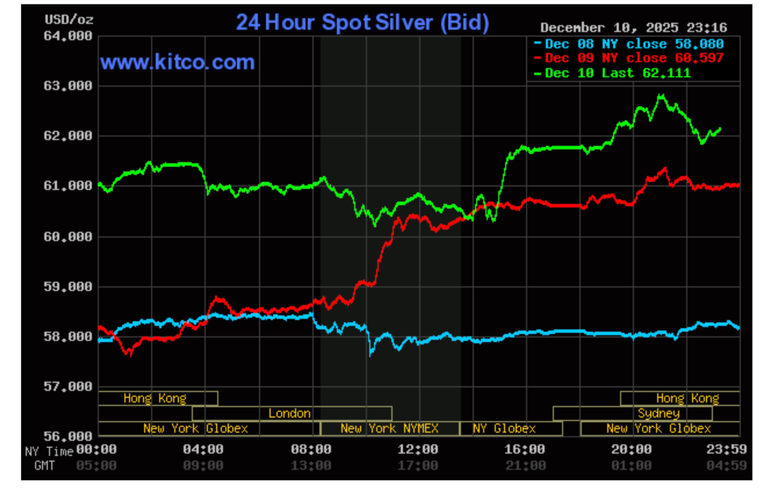 Tại thị trường thế giới, theo kitco.com, tính đến 11 giờ 13 phút sáng 11/12 (giờ Việt Nam), giá bạc thế giới bật tăng mạnh và giao dịch quanh mức hơn 62 USD/ounce. Biên độ giao dịch trong ngày từ 61,87 đến 62,22 USD/ounce.