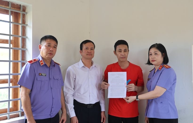 Đồng chí Đỗ Mạnh Tăng, Chánh án TAND tỉnh Hưng Yên cùng ông Nguyễn Văn Viện, Viện trưởng VKSND tỉnh Hưng Yên và bà Trần Thị Thu Trà, Phó Viện trưởng VKSND tỉnh trao các quyết định kháng nghị và thay đổi biện pháp ngăn chặn cho bị cáo Thái Khắc Thành.