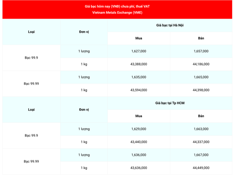 Cụ thể, tại thời điểm 10 giờ 39 phút sáng 18/11, theo Vietnam Metals Exchange (VME), giá bạc 99.99 (chưa phí, thuế VAT) tại Hà Nội được các doanh nghiệp điều chỉnh tăng nhẹ so với ngày hôm qua, niêm yết tại mức 1.635.000 đồng/lượng (mua vào) và 1.665.000 đồng/lượng (bán ra), chênh lệch 2 chiều mua bán ở mức 31.000 đồng/lượng.
