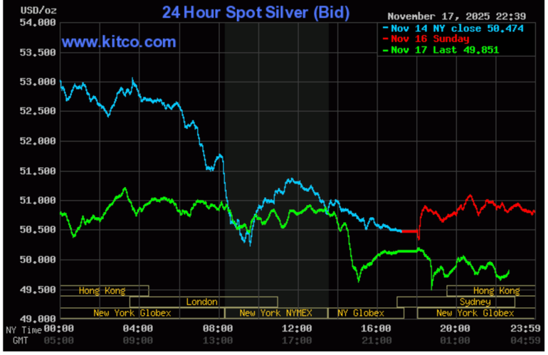 Tại thị trường thế giới, theo kitco.com, tính đến 10 giờ 39 phút sáng 18/11 (giờ Việt Nam), giá bạc giữ giảm nhẹ ở mức 0,97 USD/ounce so phiên đóng cửa hôm trước đó, giao dịch quanh mức 49,924 USD/ounce.