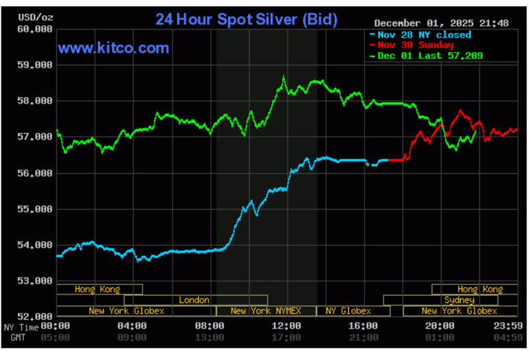 Tại thị trường thế giới, giá bạc đã có lúc tăng vọt lên trên 58 USD/ounce trong phiên giao dịch ngày đầu tiên của tháng 12, tiến đến mức cao kỷ lục khi lượng tồn kho thu hẹp, nhu cầu của nhà đầu tư tăng và những lo ngại mới về nguồn cung đẩy giá của kim loại trắng lên các mức chưa từng thấy ngay cả trong những giai đoạn thị trường biến động trước đây.