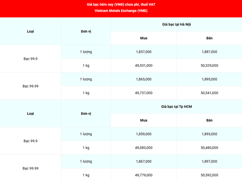 Cụ thể, tại thời điểm 9 giờ 50 phút sáng 2/12, theo Vietnam Metals Exchange (VME), giá bạc 99.99 (chưa phí, thuế VAT) tại Hà Nội niêm yết tại mức 1.865.000 đồng/lượng (mua vào) và 1.895.000 đồng/lượng (bán ra), chênh lệch 2 chiều mua-bán ở mức 30.000 đồng/lượng.