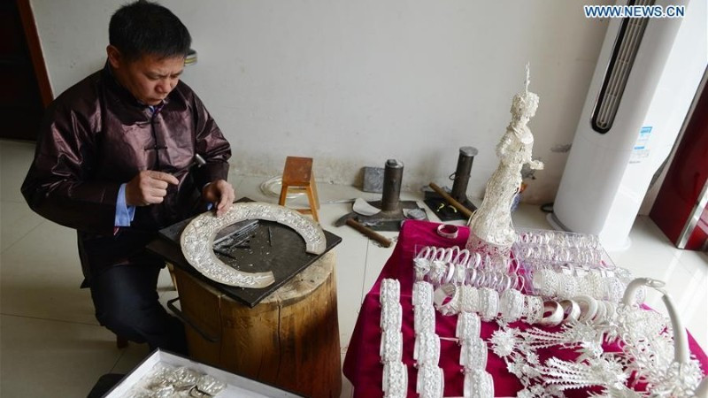 Thợ thủ công chế tác trang sức bạc tại một cửa hàng bạc ở tỉnh Quý Châu, tây nam Trung Quốc. (Ảnh: Xinhua)