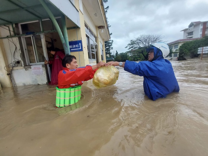 Giảng viên Trường Cao đẳng Kỹ thuật Công nghệ Quy Nhơn bơi giữa dòng nước lũ tiếp tế lương thực cho sinh viên trong ký túc xá.