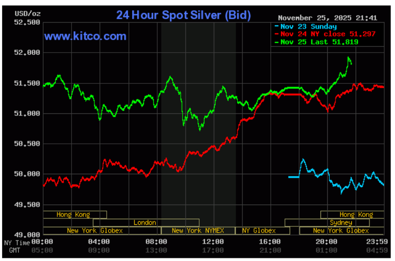Trong phiên giao dịch ngày 25/11, giá bạc duy trì ở mốc 51 USD/ounce khi chuỗi dữ liệu kinh tế Mỹ yếu hơn dự kiến, củng cố kỳ vọng Cục Dự trữ Liên bang Mỹ (FED) sẽ cắt giảm lãi suất trong tháng 12. Doanh số bán lẻ chỉ tăng 0,2% trong tháng 9, giảm so mức tăng 0,6% của tháng 8 và thấp hơn dự báo 0,4%.
