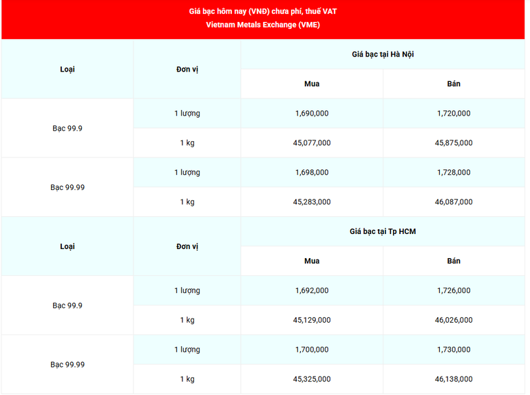 Cụ thể, tại thời điểm 9 giờ 44 phút sáng 26/11, theo Vietnam Metals Exchange (VME), giá bạc 99.99 (chưa phí, thuế VAT) tại Hà Nội tiếp tục được các doanh nghiệp điều chỉnh tăng so phiên giao dịch ngày hôm qua, niêm yết tại mức 1.690.000 đồng/lượng (mua vào) và 1.720.000 đồng/lượng (bán ra), chênh lệch 2 chiều mua-bán ở mức 30.000 đồng/lượng.