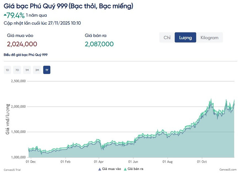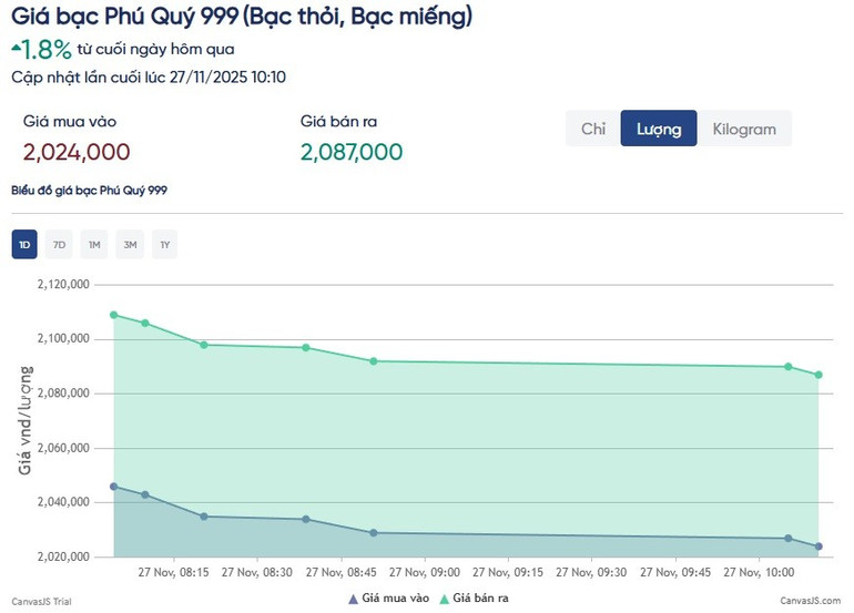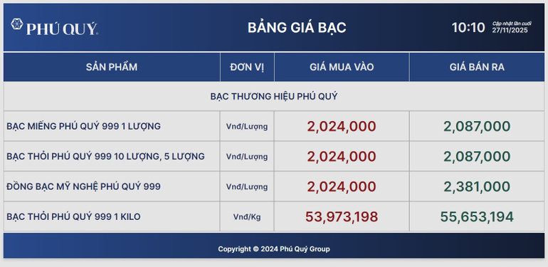 Tập đoàn Vàng bạc Đá quý Phú Quý niêm yết giá bạc miếng và bạc thỏi 999 lúc 10 giờ 10 phút sáng 27/11 ở mức 2.024.000 đồng/lượng (mua vào) và 2.087.000 đồng/lượng (bán ra).