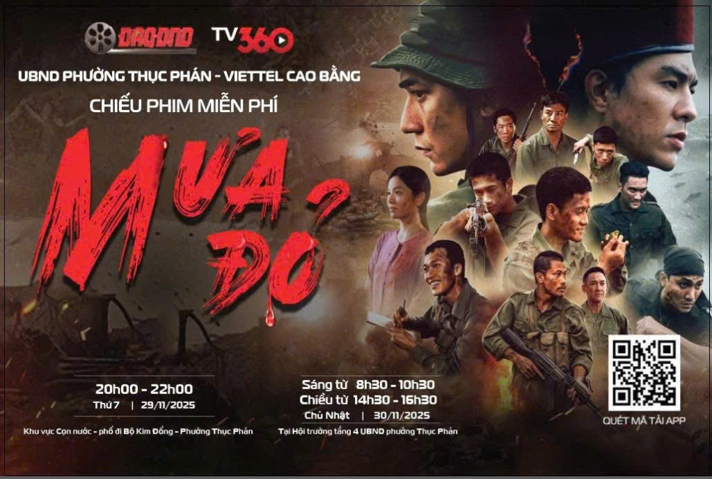 Tối thứ Bảy 29/11, thời điểm diễn ra hoạt động của phố đi bộ Kim Đồng, bộ phim "Mưa đỏ" sẽ được trình chiếu miễn phí trên màn hình Led tại sân Cọn nước thông qua ứng dụng TV360 để phục vụ nhân dân và du khách. Ngày 30/11, tiếp tục chiếu miễn phí tại UBND phường Thục Phán.
