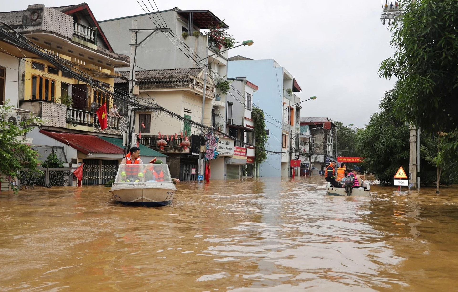 Cảnh sát PCCC và CNCH Công an tỉnh Lào Cai túc trực tại "điểm nóng" khi nước lũ dâng cao gây ngập nhiều nơi. Ảnh: Thu Huyền