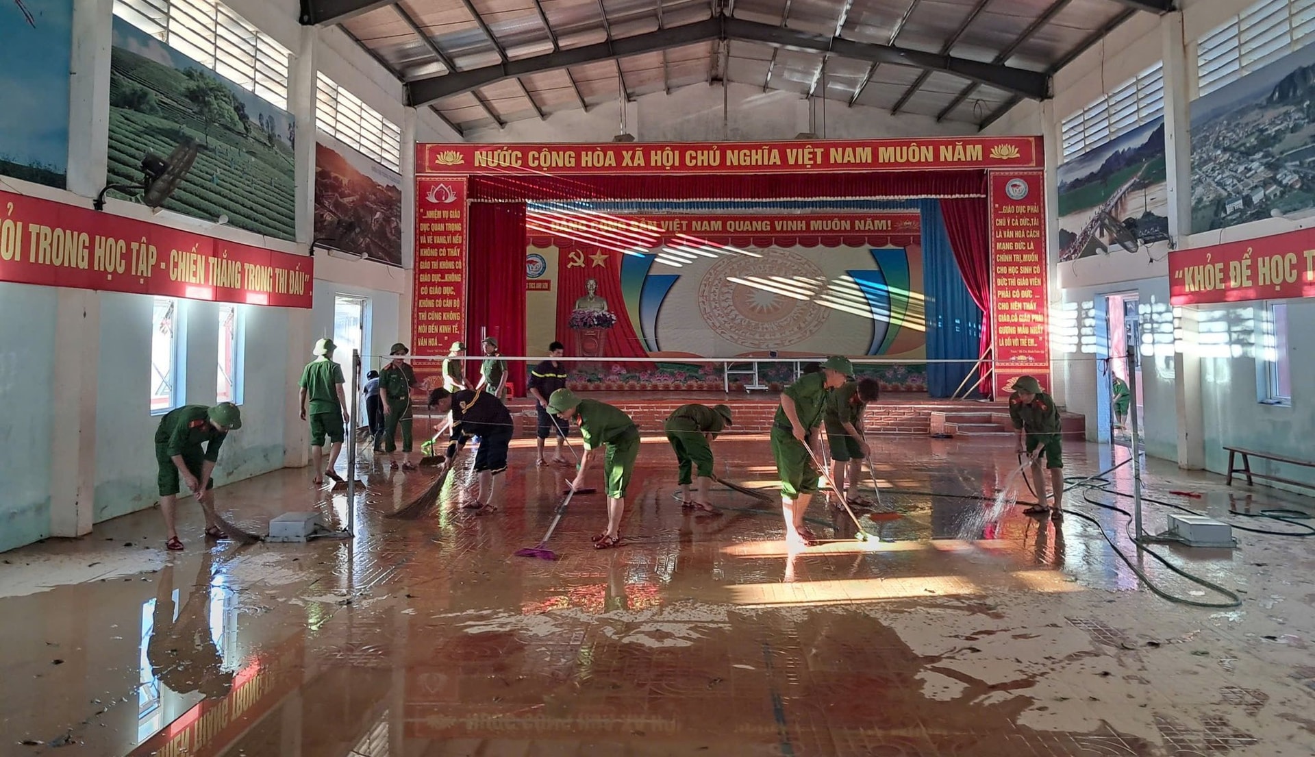 Tại tỉnh Nghệ An, cán bộ, chiến sĩ Cảnh sát PCCC và CNCH dọn dẹp một trường học sau khi nước rút để các em học sinh sớm trở lại học tập. Ảnh: PC07.