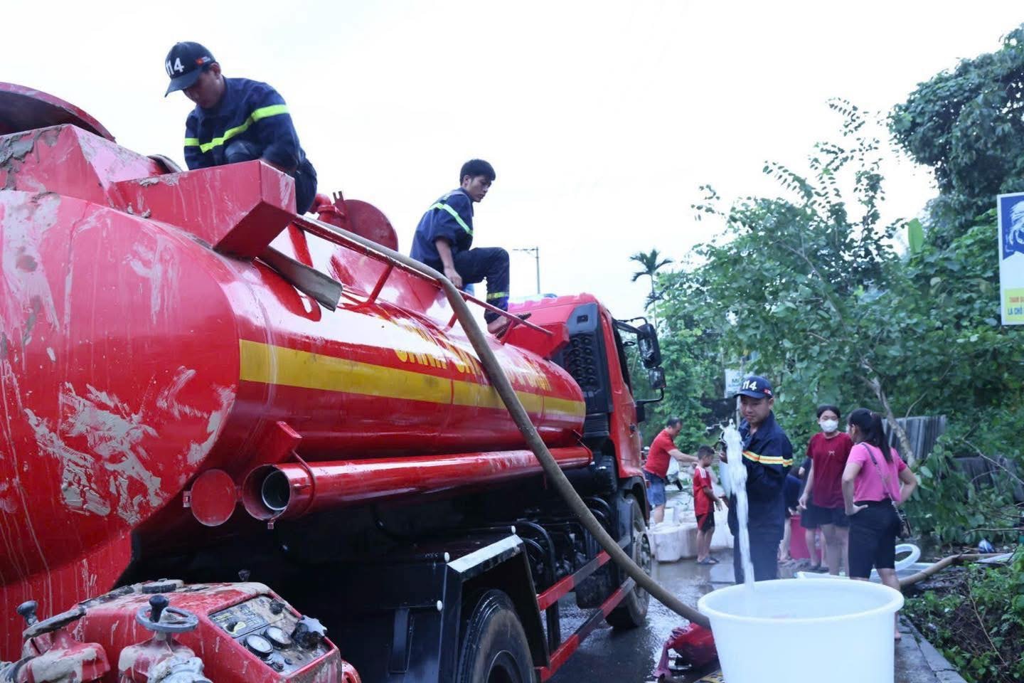 Cảnh sát PCCC và CNCH Công an tỉnh Tuyên Quang tiếp nước sạch cho người dân phường Hà Giang 1 vừa vượt qua lũ lụt. Ảnh: PC07
