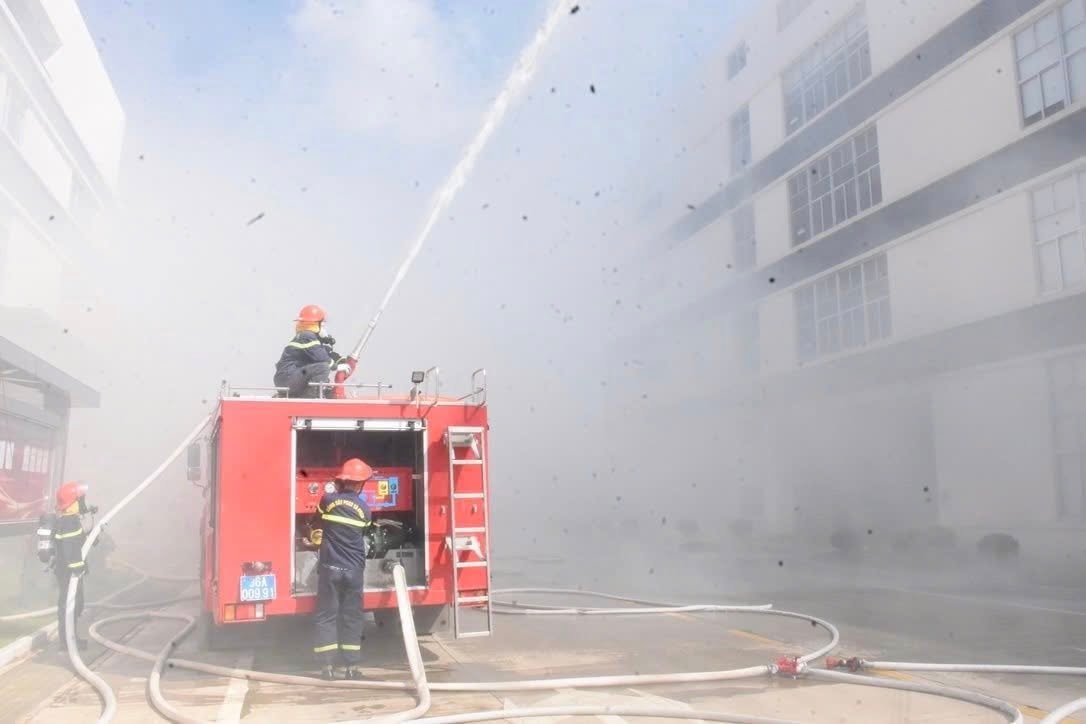 Cảnh sát PCCC Công an tỉnh Thanh Hóa diễn tập phương án chữa cháy và cứu nạn, cứu hộ cấp tỉnh năm 2025 tại Công ty TNHH Công nghiệp SAB Việt Nam, KCN Bỉm Sơn. Ảnh: PC07