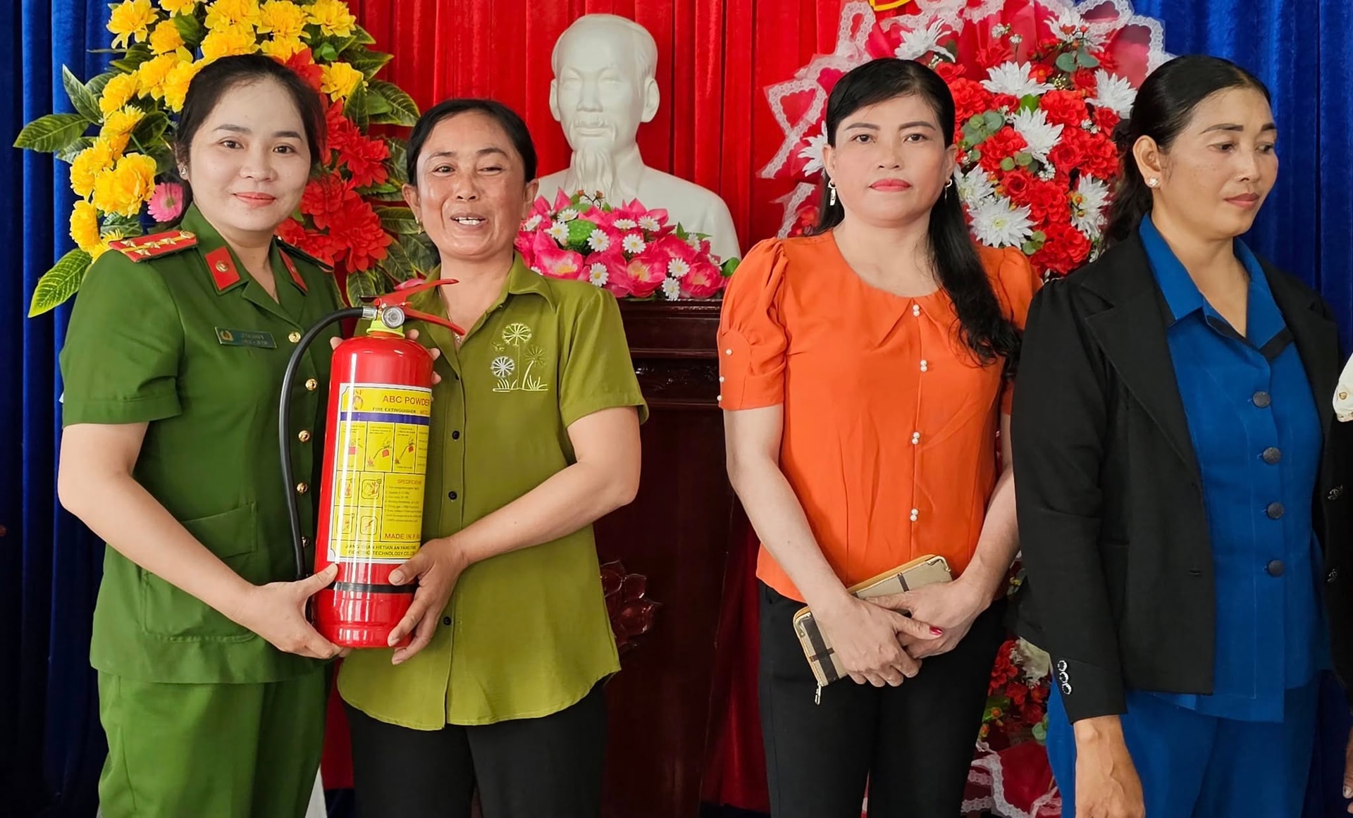 Cảnh sát PCCC và CNCH Công an tỉnh Cà Mau tặng bình chữa cháy cho mô hình Tổ phụ nữ phòng, chống tội phạm. Ảnh: PC07