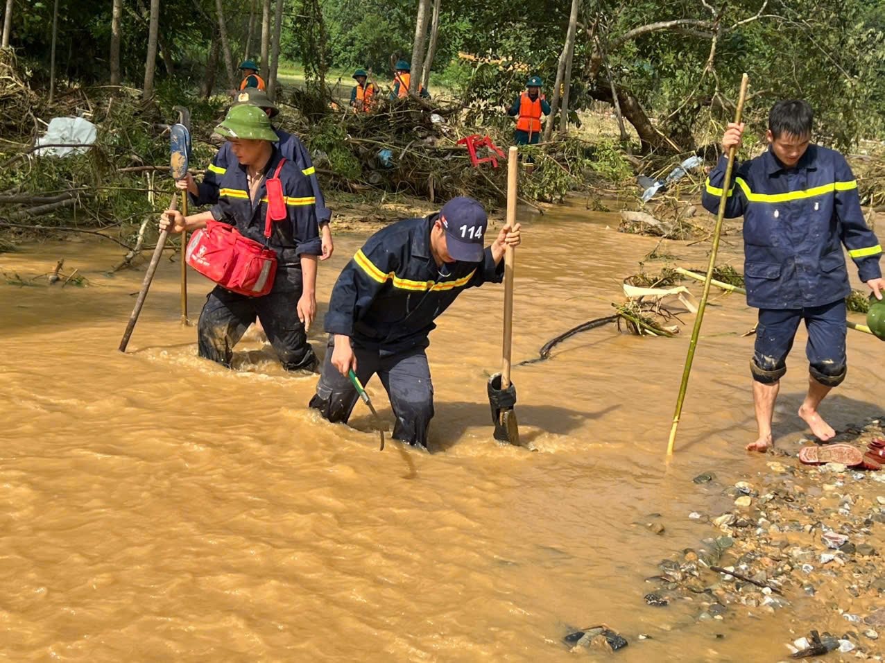 Chiến sĩ cảnh sát PCCC và CNCH Công an tỉnh Cao Bằng băng qua vùng nước lũ đi giúp dân. Ảnh: PC07.