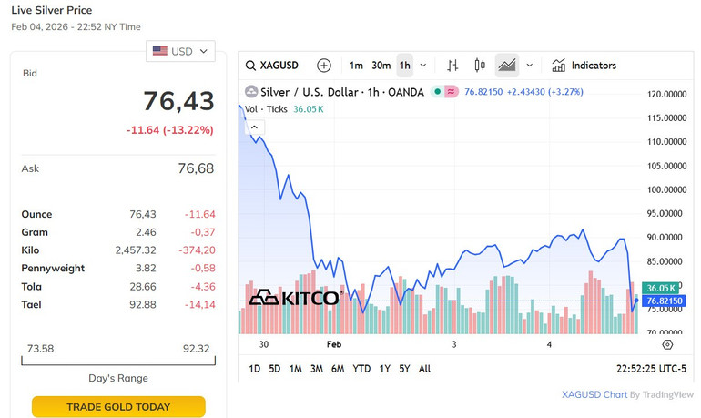 Tại thị trường thế giới, theo kitco.com, tính đến 10 giờ 30 phút sáng 5/2 (giờ Việt Nam), giá bạc đảo chiều giảm mạnh sau 2 phiên hồi phục, giao dịch quanh ngưỡng 76 USD/ounce, giảm 13,22% so chốt phiên trước đó. Biên độ giao dịch trong ngày từ 73,58 đến 92,32 USD/ounce.