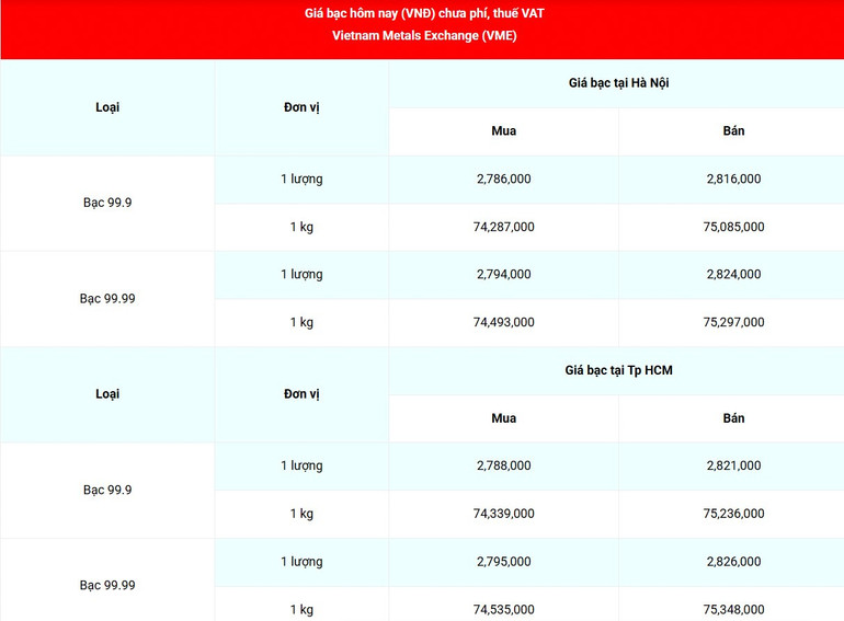 Cụ thể, tại thời điểm 10 giờ sáng 5/2, theo Vietnam Metals Exchange (VME), giá bạc 99.99 (chưa phí, thuế VAT) tại Hà Nội niêm yết ở mức 2.794.000 đồng/lượng (mua vào) và 2.824.000 đồng/lượng (bán ra), chênh lệch 2 chiều mua-bán ở mức 30.000 đồng/lượng.