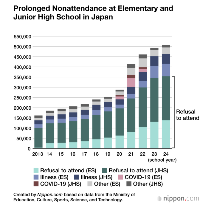 Khi số lượng trẻ em tại Nhật Bản đang giảm, tình trạng học sinh không đến trường gia tăng đã trở thành vấn đề đáng lo ngại trong hệ thống giáo dục nước này.