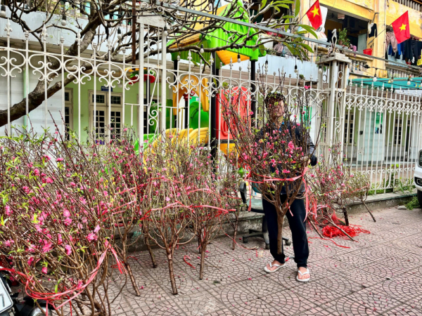 Đào Nhật Tân trong phiên chợ cuối năm vẫn rực rỡ khoe sắc. Tuy nhiên, giá đã hạ hơn những ngày trước khá nhiều. Cành đào bích dáng tròn hôm qua được người bán trên phố Ngọc Lâm rao 500.000 đồng, hôm nay còn 300.000 đồng. "Ngày cuối rồi, bán được bao nhiêu thì bán, thu hồi vốn về thôi. Tôi cũng chỉ bán đến trưa là nghỉ", anh Nguyễn Văn Tuấn, người bán đào chia sẻ.