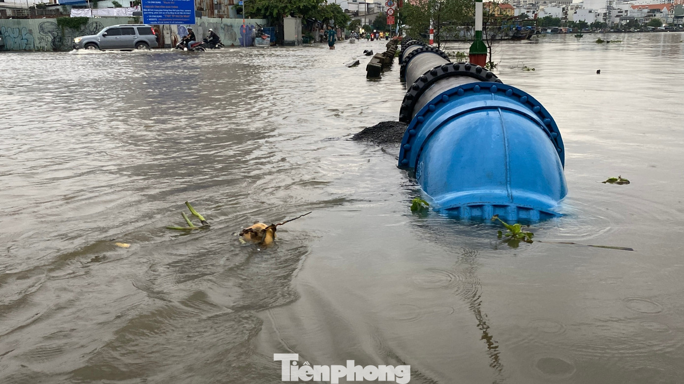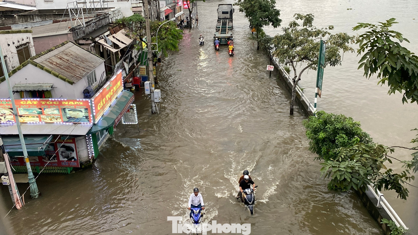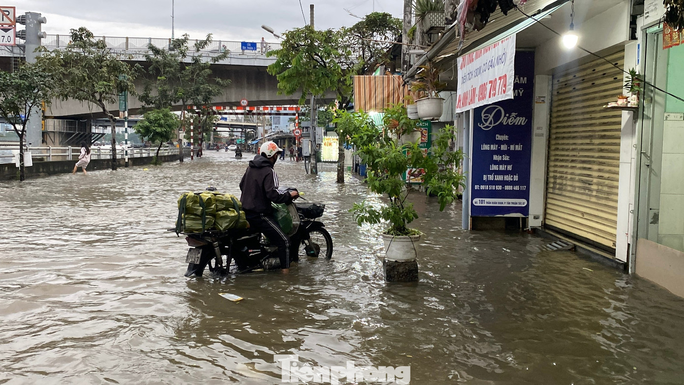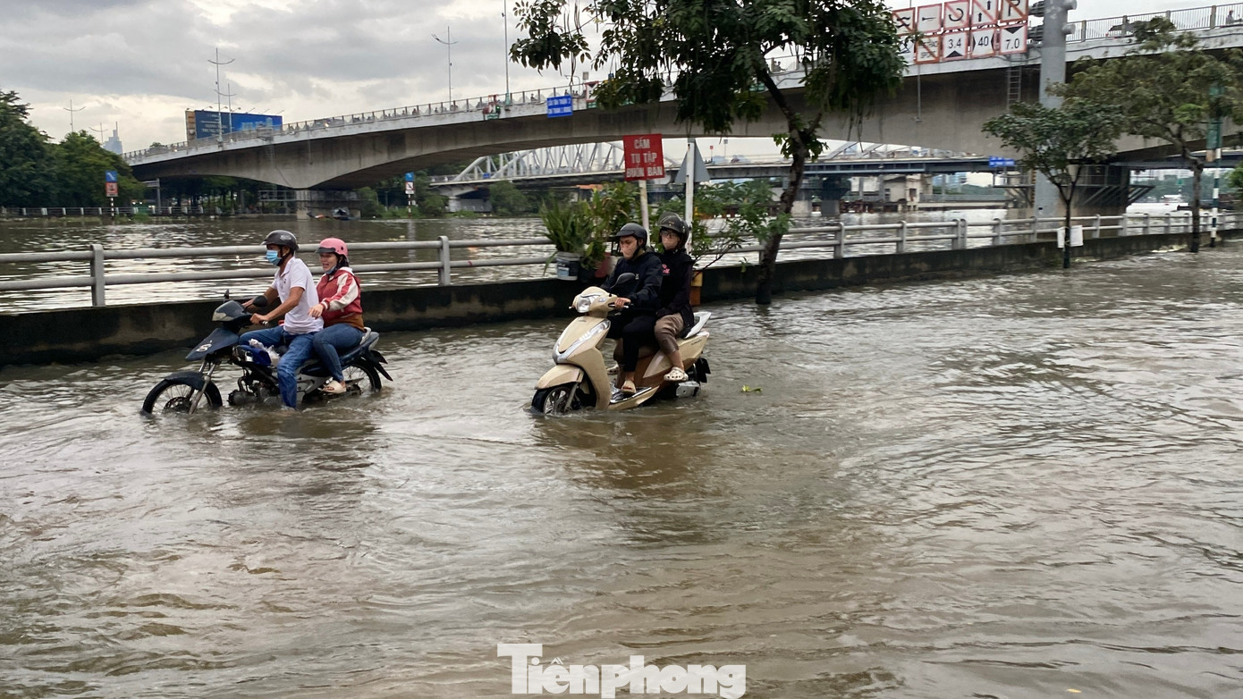 Theo ghi nhận, các tuyến đường như Trần Xuân Soạn (phường Tân Thuận), Phạm Hữu Lầu (phường Tân Mỹ), Huỳnh Tấn Phát (phường Phú Thuận) cùng hàng loạt tuyến ở khu vực phía Nam thành phố như Lê Văn Lương, Đào Sư Tích, Nguyễn Bình (xã Nhà Bè) vẫn trong tình trạng ngập sâu, nước dâng cao gần nửa bánh xe máy.