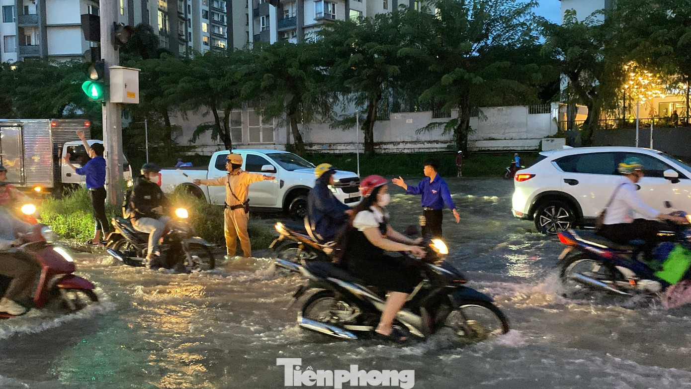 Tại đường Trần Xuân Soạn (phường Tân Thuận), một đoạn dài hơn 1 km ngập sâu khiến hàng loạt xe chết máy giữa đường. Lực lượng chức năng cùng các đoàn viên thanh niên phường đã túc trực xuyên buổi chiều để hỗ trợ người dân di chuyển qua khu vực, đồng thời cảnh báo, nhắc nhở người dân không cố gắng đi qua vùng ngập sâu nhằm hạn chế xe “chết máy” và nguy cơ tai nạn.