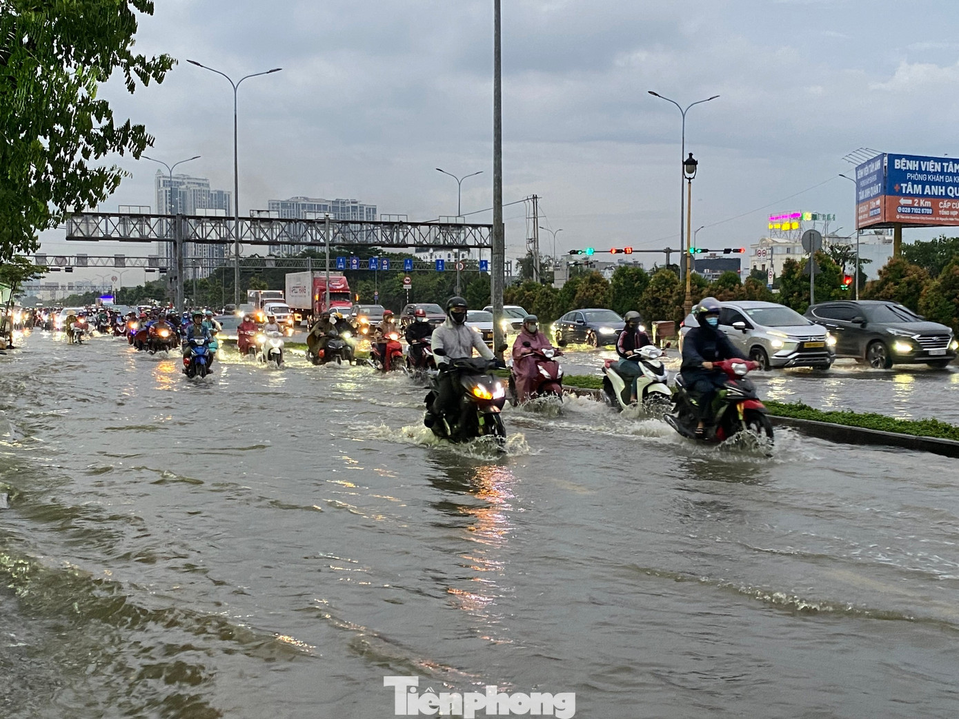 Một đoạn đường Nguyễn Văn Linh (gần nút giao với đường Nguyễn Thị Thập, phường Tân Mỹ) bị ngập sâu gần nửa bánh xe. Ảnh: Hữu Huy