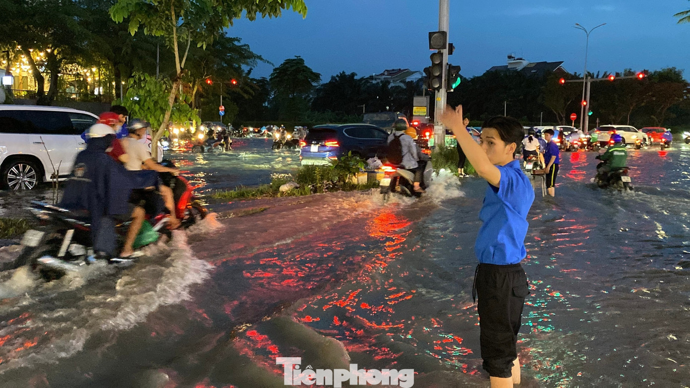 Lực lượng đoàn viên thanh niên tham gia điều tiết phương tiện, hỗ trợ người dân di chuyển an toàn qua điểm ngập. Ảnh: Hữu Huy