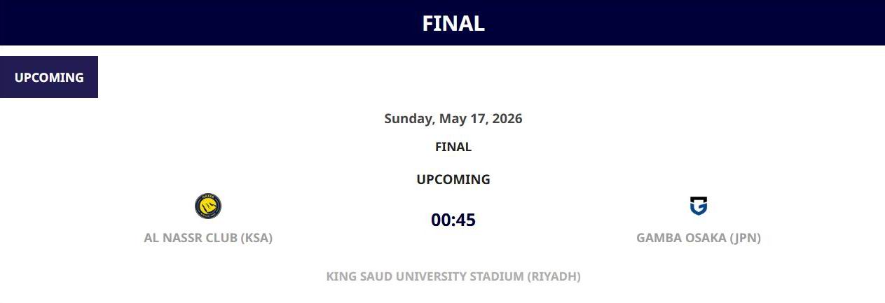 Tuy nhiên Ronaldo và Al Nasr lại gặp đối thủ cực mạnh của Nhật Bản Gamba Osaka ở chung kết. Nếu như trận chung kết Champions League 2 mùa trước là hai đối thủ vô danh Lion City Sailors của Singapore và Arkadag của Turkmenistan thì trận cuối cùng giải mùa này rất đáng xem.