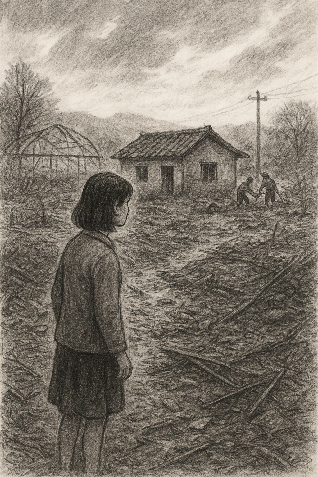 Gió từ triền đồi thổi xuống, mang theo hơi ẩm còn sót sau lũ, phảng phất mùi bùn ngai ngái nhưng cũng xen lẫn chút hương cây lá đang hồi sinh. An khẽ cúi xuống, ấn từng hạt giống vào lớp đất mới được trộn lại. Mỗi hạt, cô đặt bằng cả sự nâng niu như muốn gửi vào đó cả lời cầu mong bình yên cho gia đình mình. Bùn vẫn còn ngấm dưới đôi dép, mặt đất mềm nhũn, mỗi bước đi là một tiếng ọp ẹp như than thở. Xa xa, tiếng bố và anh Bình gọi nhau í ới, xen lẫn tiếng kim loại chạm vào nhau lách cách. Những âm thanh ấy khiến lòng An bình yên kỳ lạ.
