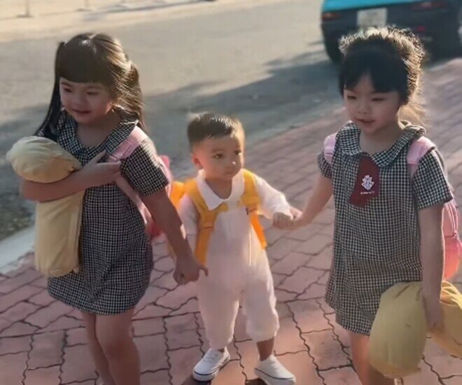 Con trai Vân Trang được 2 chị nắm tay đến trường.