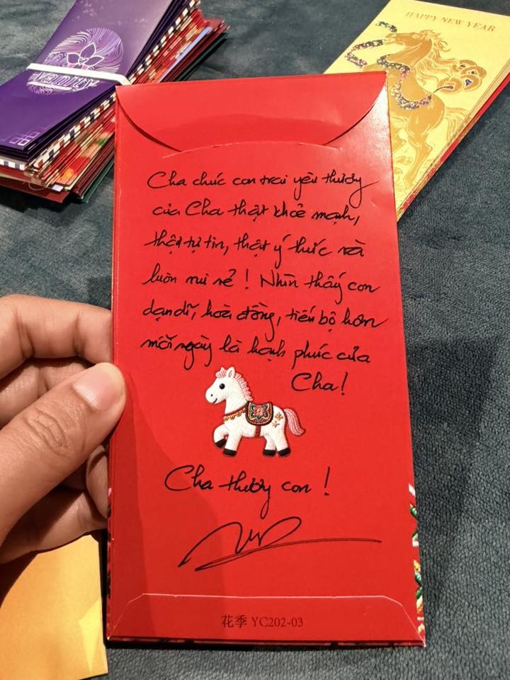 Nhạc sĩ Nguyễn Văn Chung chuẩn bị phong bao lì xì cho con trai vào sáng mùng 1 Tết. Anh tự tay viết những dòng chúc, lời nhắn gửi ấm áp đến các con.