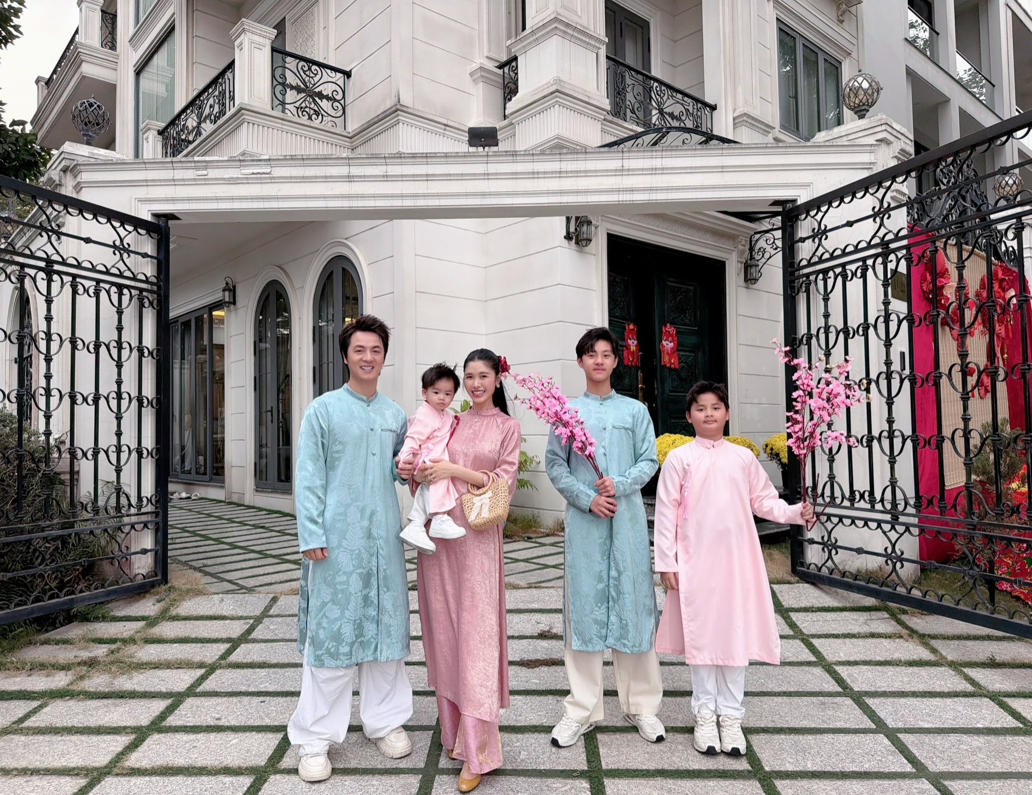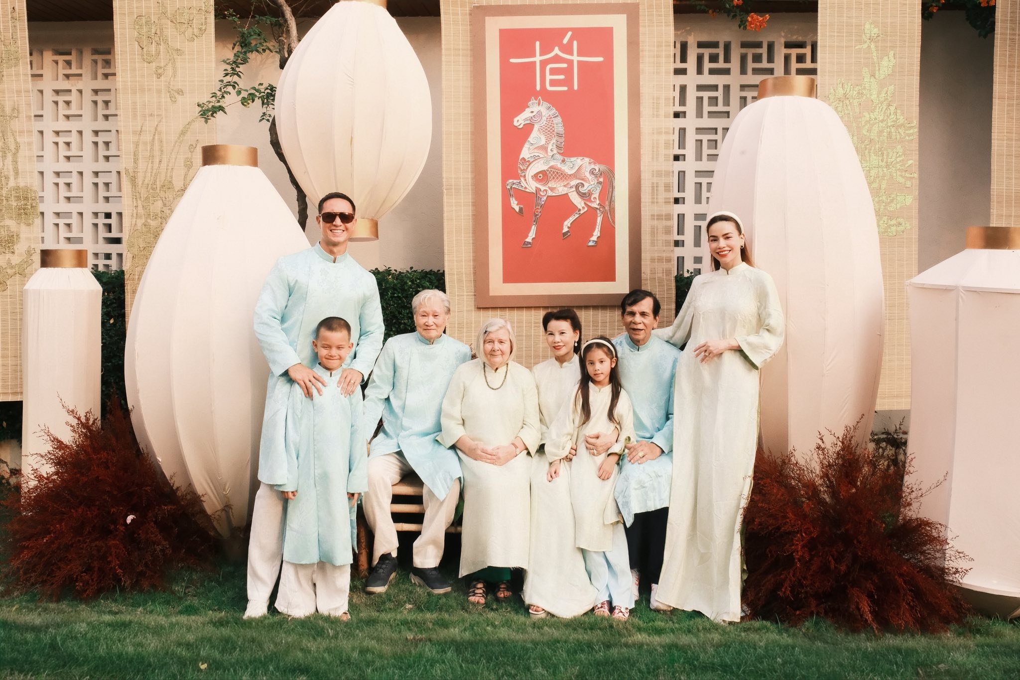 Đại gia đình Hồ Ngọc Hà - Kim Lý quây quần bên nhau trong ngày đầu năm. Các thành viên cùng diện áo dài màu pastel nhã nhặn, ton sur ton. "Mùng 1 Tết, gia đình của Hà xin gửi lời chúc Tết đến tất cả mọi người, những ai hữu duyên nhìn thấy dòng tin nhắn này thật nhiều sức khỏe, mã đáo thành công, phi nước đại đến những giấc mơ của mình và đặc biệt luôn thật nhiều hạnh phúc", nữ ca sĩ chia sẻ.